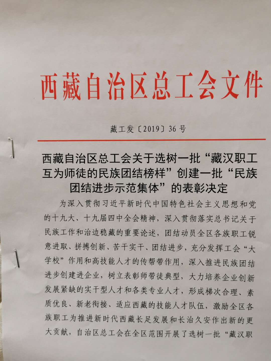 西藏自治區(qū)總工會關于選樹一批 "藏漢職工互為師徒的民族團結(jié)榜樣 "創(chuàng)建一批 "民族團結(jié)進步示范集體 "的表彰決定