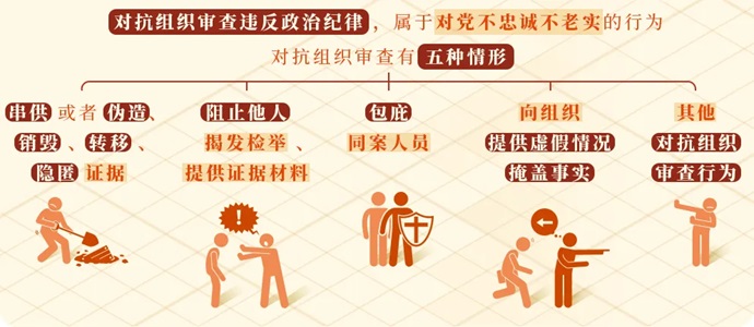 《中國(guó)共產(chǎn)黨紀(jì)律處分條例》第六十三條規(guī)定了對(duì)抗組織審查,應(yīng)予處分的五種情形:串供或者偽造、銷(xiāo)毀、轉(zhuǎn)移、隱匿證據(jù);阻止他人揭發(fā)檢舉、提供證據(jù)材料;包庇同案人員;向組織提供虛假情況,掩蓋事實(shí);其他對(duì)抗組織審查行為。