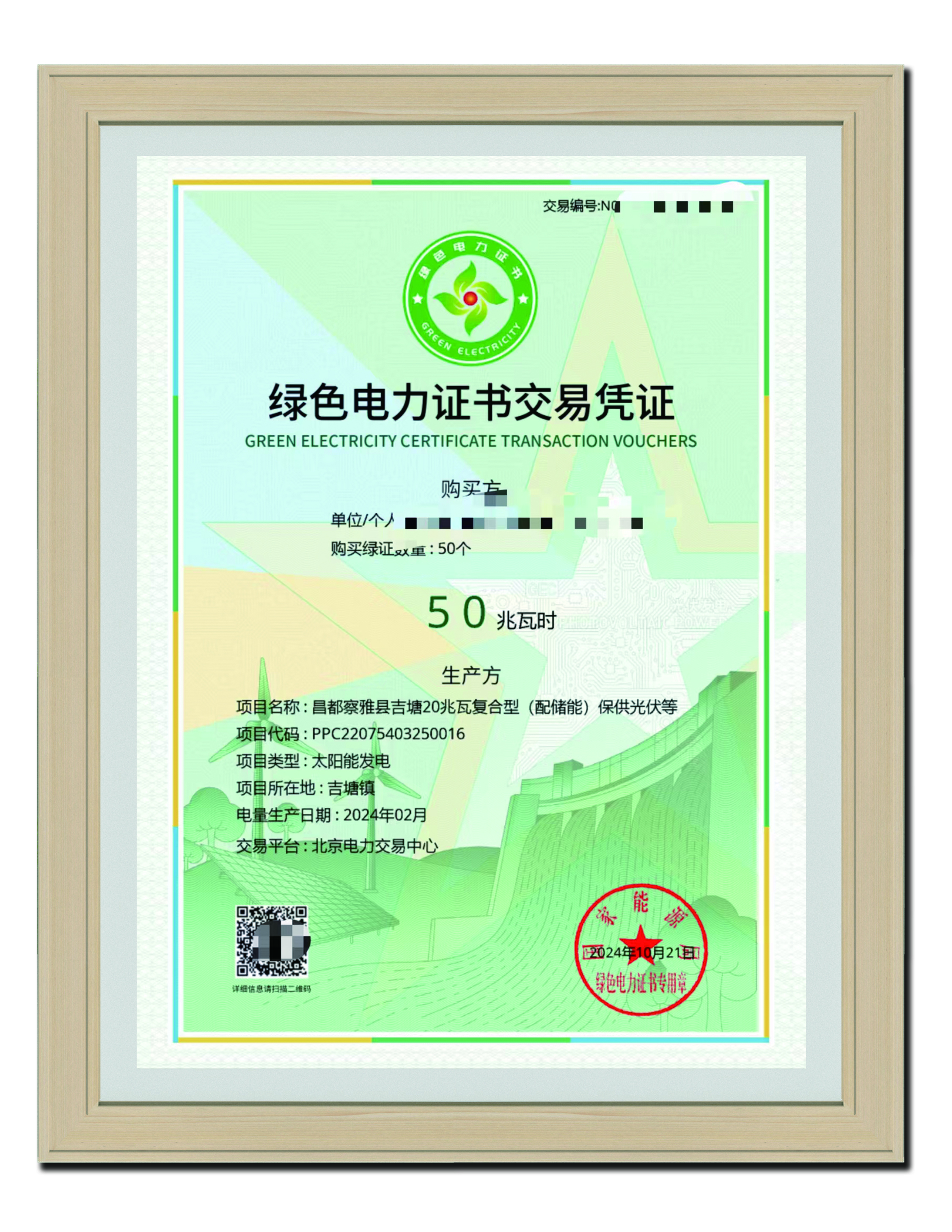 2024年10月21日綠色電力證書交易憑證50兆瓦時