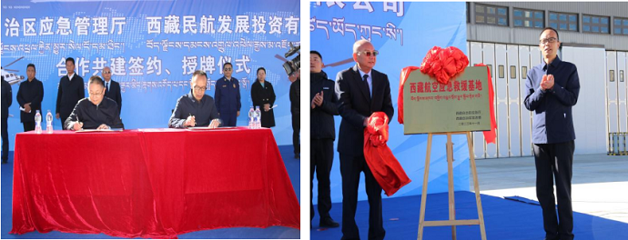 11月16日上午,西藏自治區(qū)應(yīng)急管理廳與西藏民航發(fā)展投資有限公司戰(zhàn)略合作協(xié)議簽約暨“西藏航空應(yīng)急救援基地”揭牌儀式在拉薩舉行。區(qū)應(yīng)急管理廳黨委副書記、廳長洪力,區(qū)發(fā)展與改革委員會副主任付玉壽,西藏開發(fā)投資集團有限公司黨委書記、董事長,民航投公司董事長祁騰武共同出席簽約和揭牌儀式。