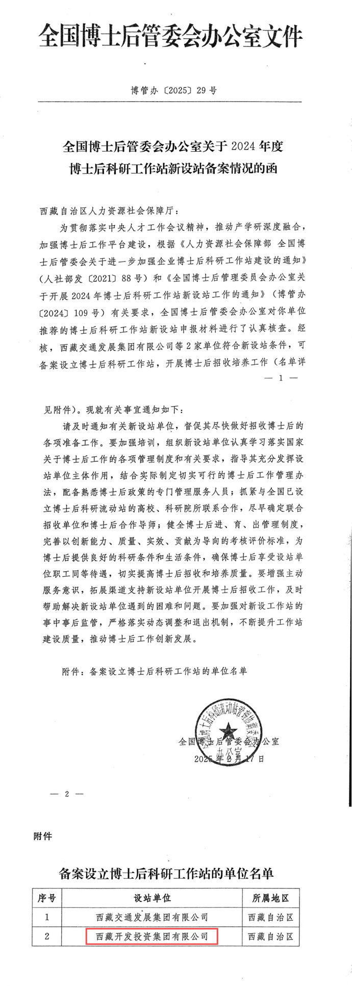 近日,全國博士后管委會辦公室公布了《關(guān)于2024年度博士后科研工作站新設(shè)站備案情況的函》,西藏開投集團成功獲批設(shè)立博士后科研工作站,標志著集團在科技創(chuàng)新和人才培養(yǎng)方面邁上新臺階,將為推進集團清潔能源產(chǎn)業(yè)高質(zhì)量發(fā)展注入強勁動力。