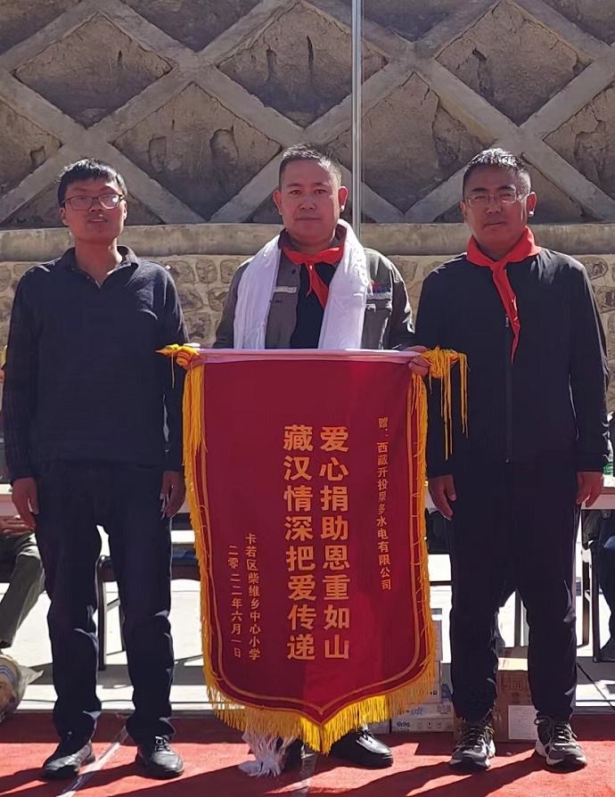 果多水電公司代表張二林同志作了題為“祖國(guó)的未來(lái),民族的希望”的講話,并代表果多水電公司給學(xué)校捐贈(zèng)了學(xué)習(xí)用品,足球、排球、羽毛球等,勉勵(lì)孩子們要樹立遠(yuǎn)大理想,努力學(xué)習(xí),健康成長(zhǎng),以優(yōu)異的成績(jī)回報(bào)社會(huì)、回報(bào)祖國(guó)。柴維鄉(xiāng)小學(xué)贈(zèng)送了“愛心捐助恩重如山,藏漢情深把愛傳遞”的錦旗,感謝果多水電公司對(duì)學(xué)校的關(guān)心支持幫助。