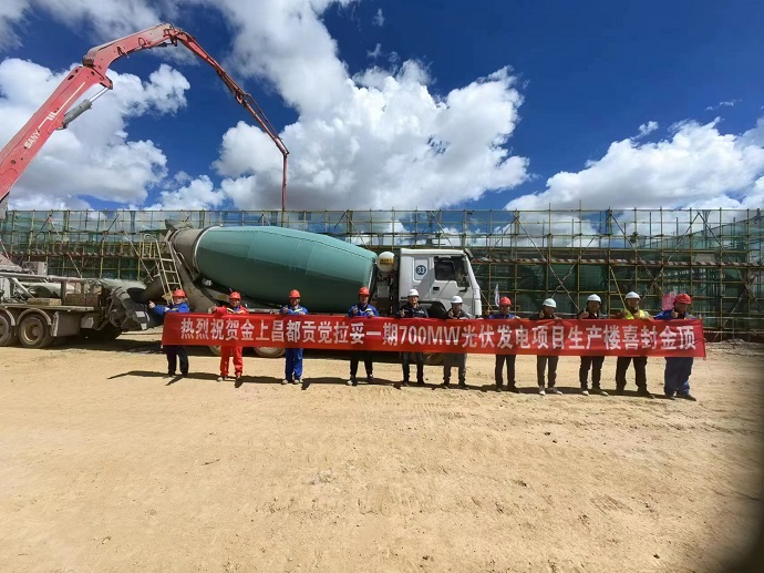 9月28日,隨著生產(chǎn)樓屋面板最后一平方米混凝土澆筑完成,金上昌都貢覺拉妥一期700MW光伏項目生產(chǎn)樓順利封頂,項目參建單位辛苦勞作成果終于可以交上第一份答卷。