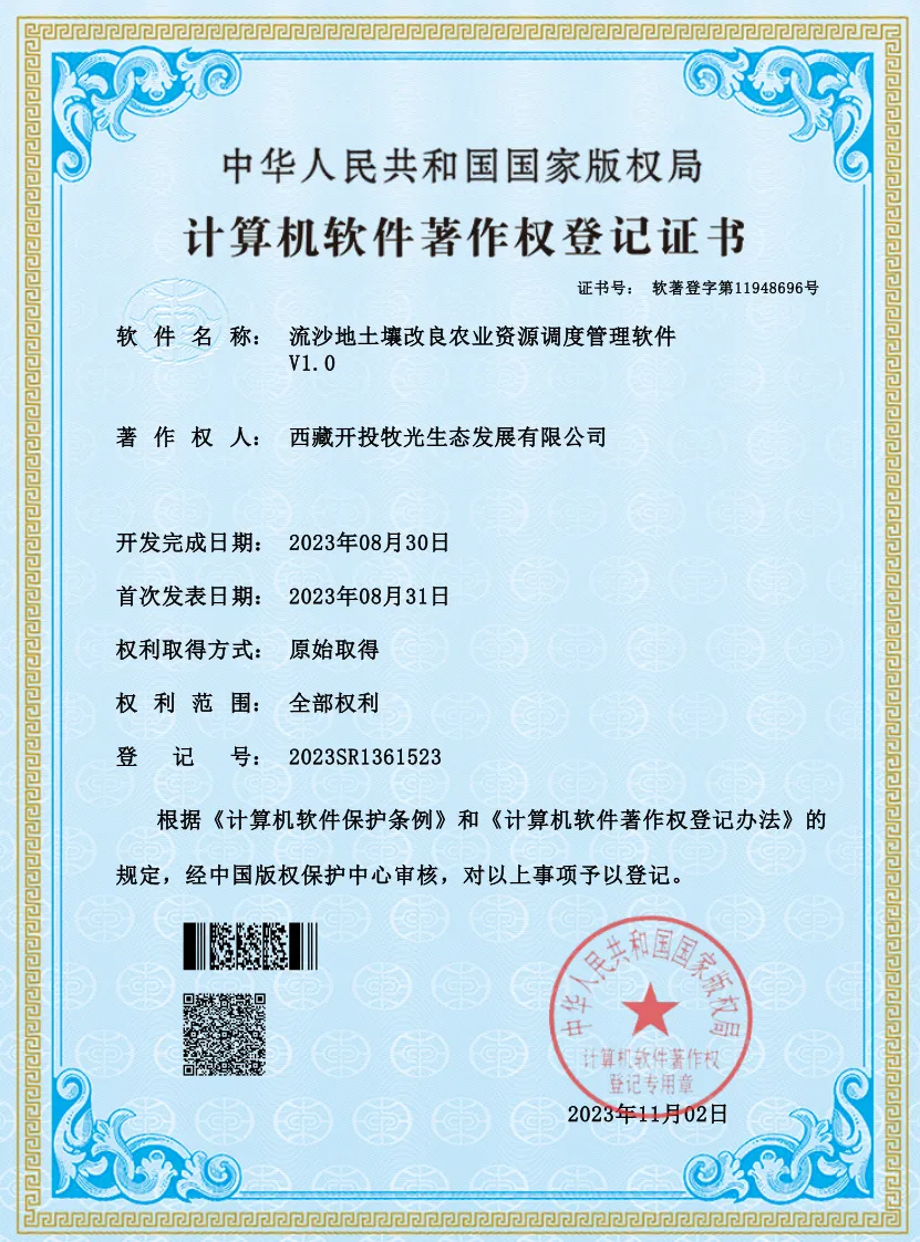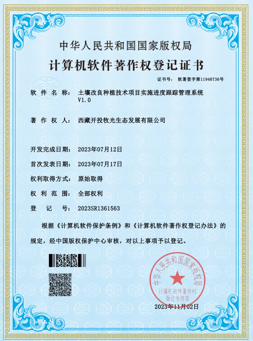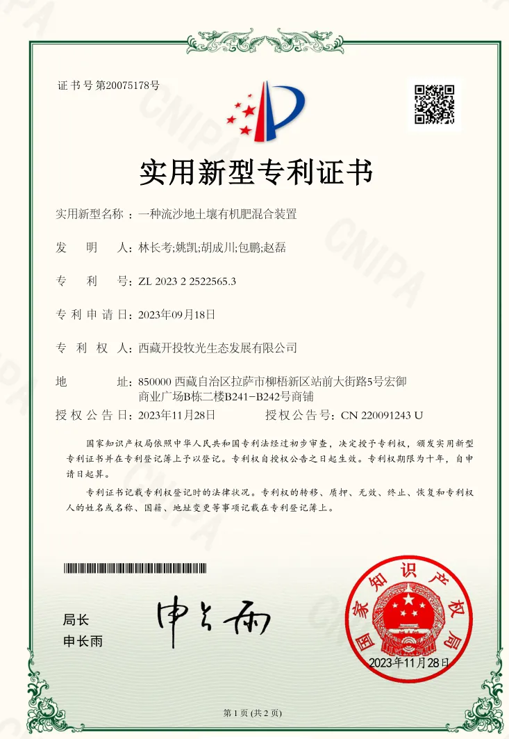 經(jīng)過一年多的摸索,西藏開投在拉薩南北山綠化工程項(xiàng)目形成了豐富的技術(shù)成果,于近日成功申報(bào)獲取了1項(xiàng)實(shí)用新型專利和5項(xiàng)計(jì)算機(jī)軟件著作權(quán)。分別是《一種流沙地土壤有機(jī)肥混合裝置》實(shí)用新型專利和《土壤改良種植技術(shù)項(xiàng)目實(shí)施進(jìn)度跟蹤管理系統(tǒng)V1.0》《流沙地土壤改良技術(shù)數(shù)據(jù)采集分析管理系統(tǒng)V1.0》《流沙地土壤改良農(nóng)業(yè)資源調(diào)度管理軟件V1.0》《荒山種植噴灌施工計(jì)劃數(shù)字化管理系統(tǒng)V1.0》《荒山種植噴灌施工智能化控制管理軟件V1.0》計(jì)算機(jī)軟件著作權(quán)。