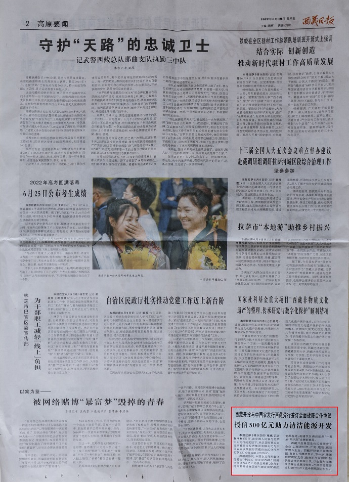 ?。ň幷甙矗?月10日,《人民日報(bào)》客戶端西藏頻道報(bào)道了《授信500億元 助力西藏清潔能源開發(fā)》?!段鞑厝請?bào)》2022年6月10日在第2版“高原要聞”欄目刊登文章,報(bào)道《授信500億元|西藏開投集團(tuán)與中國農(nóng)發(fā)行西藏分行簽訂全面戰(zhàn)略合作協(xié)議》。西藏電視臺2022年6月10日在西藏電視臺影視文化頻道《今晚九點(diǎn)》欄目報(bào)道了《授信500億元|西藏開投集團(tuán)與中國農(nóng)發(fā)行西藏分行簽訂全面戰(zhàn)略合作協(xié)議》,《珠峰云》平臺同步播放。新華網(wǎng)、經(jīng)濟(jì)日報(bào)、西藏衛(wèi)視、西藏日報(bào)客戶端、網(wǎng)信西藏、今日頭條等媒體均報(bào)道了相關(guān)新聞。全文如下: