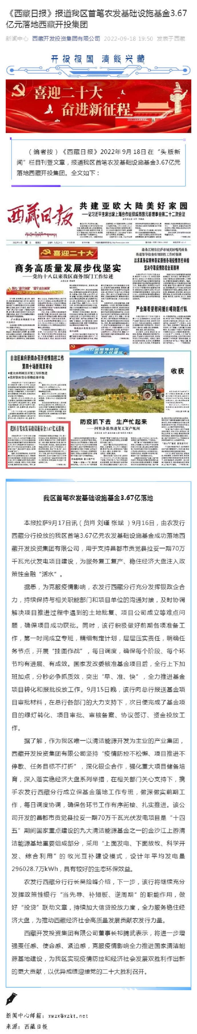 《西藏日報》報道我區(qū)首筆農(nóng)發(fā)基礎(chǔ)設(shè)施基金3.67億元落地西藏開投集團