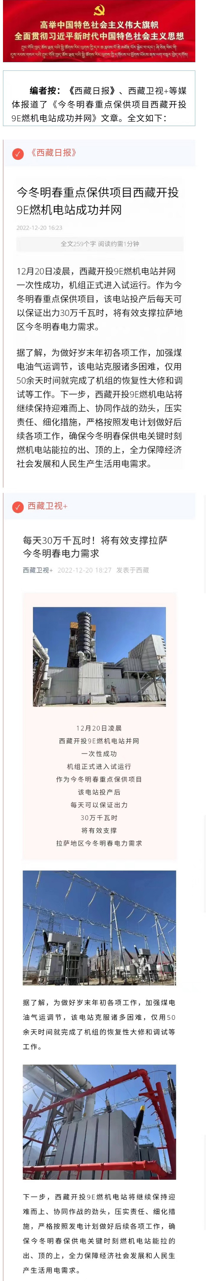 《西藏日?qǐng)?bào)》、西藏衛(wèi)視+報(bào)道今冬明春重點(diǎn)保供項(xiàng)目西藏開(kāi)投9E燃機(jī)電站成功并網(wǎng)