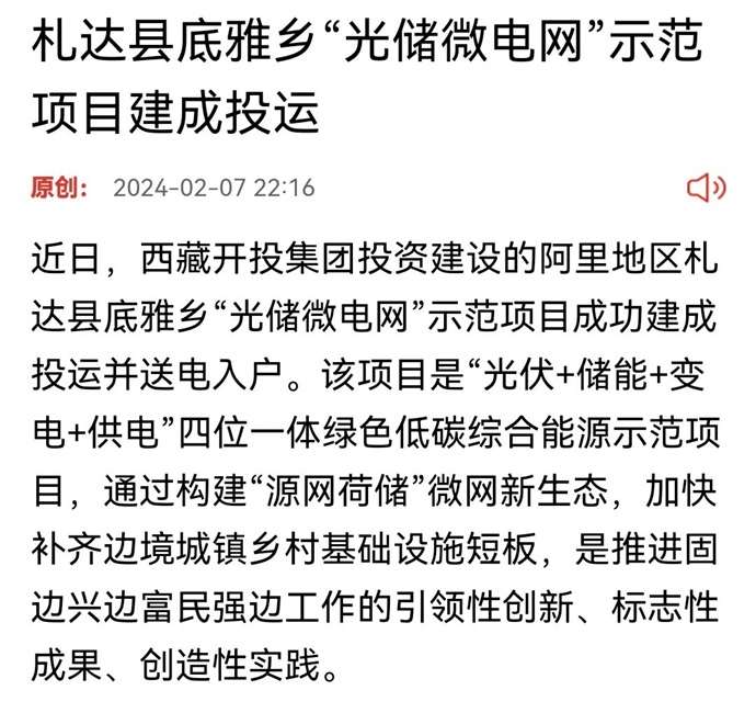 媒體報(bào)道丨西藏日?qǐng)?bào)《札達(dá)縣底雅鄉(xiāng)“光儲(chǔ)微電網(wǎng)”示范項(xiàng)目建成投運(yùn)》