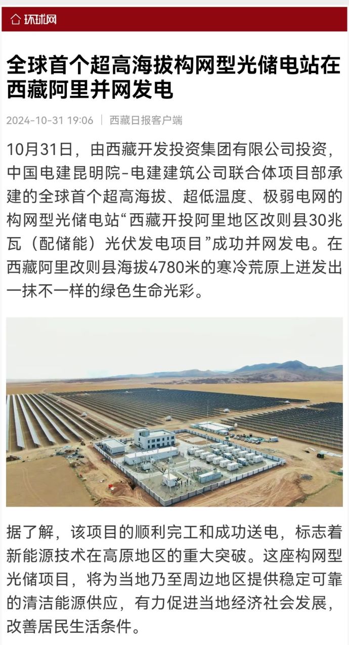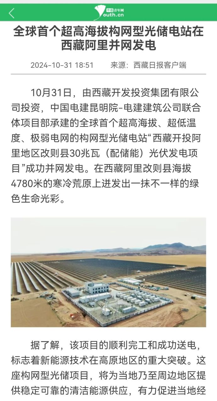 10月31日,由西藏開投集團(tuán)投資、中國電建昆明院-電建建筑公司聯(lián)合體項(xiàng)目部承建的,全球首個(gè)超高海拔、超低溫度、極弱電網(wǎng)智能組串式構(gòu)網(wǎng)型光儲(chǔ)電站——西藏開投阿里地區(qū)改則縣30兆瓦(配儲(chǔ)能)光伏發(fā)電項(xiàng)目,成功并網(wǎng)發(fā)電,標(biāo)志著新能源技術(shù)在高原地區(qū)的重大突破。