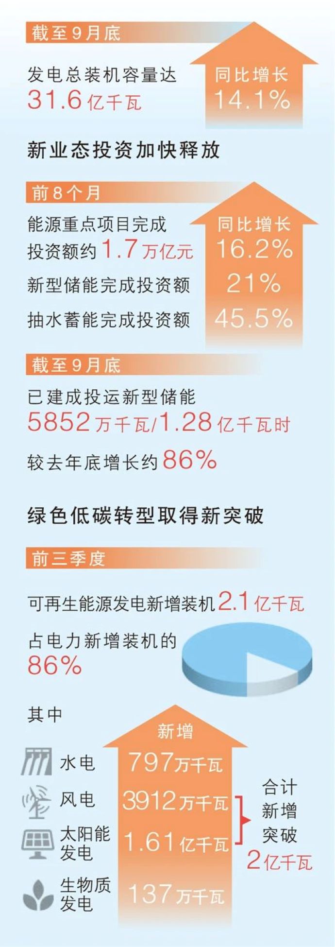能源新業(yè)態(tài)投資多點(diǎn)開花。前8個(gè)月,新型儲(chǔ)能完成投資額同比增長(zhǎng)21%,抽水蓄能完成投資額同比增長(zhǎng)45.5%。甘肅、青海、新疆一批多能互補(bǔ)清潔能源基地項(xiàng)目有序推進(jìn),內(nèi)蒙古在建綠氫制備項(xiàng)目、河南在建加氫設(shè)施項(xiàng)目持續(xù)形成有效投資。