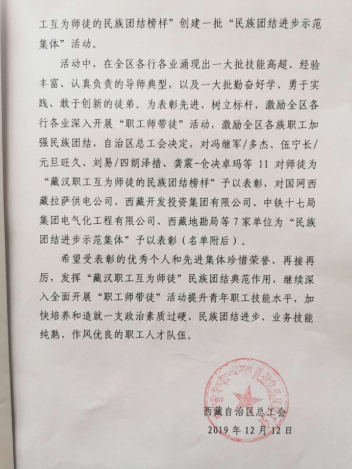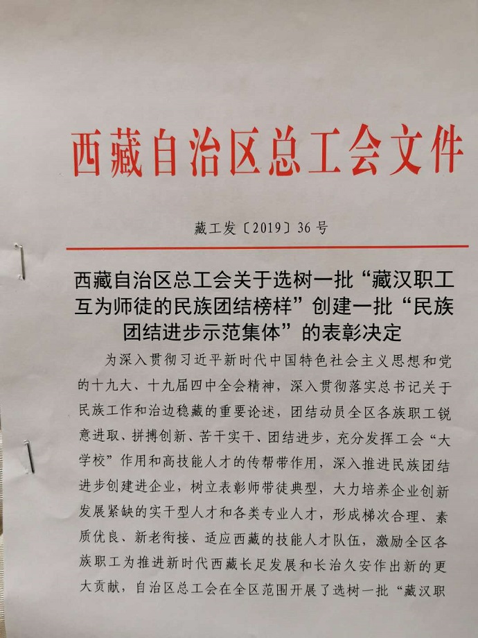 西藏自治區(qū)總工會關(guān)于選樹一批"藏漢職工互為師徒的民族團(tuán)結(jié)榜樣"創(chuàng)建一批"民族團(tuán)結(jié)進(jìn)步示范集體"的表彰決定
