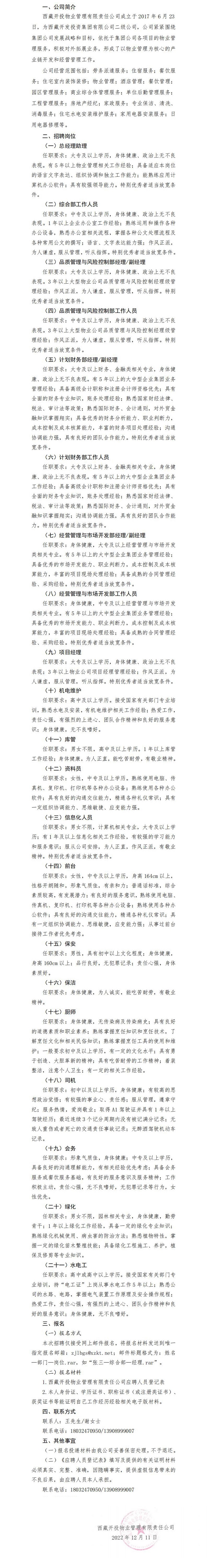 西藏開投物業(yè)管理有限責任公司招聘公告
