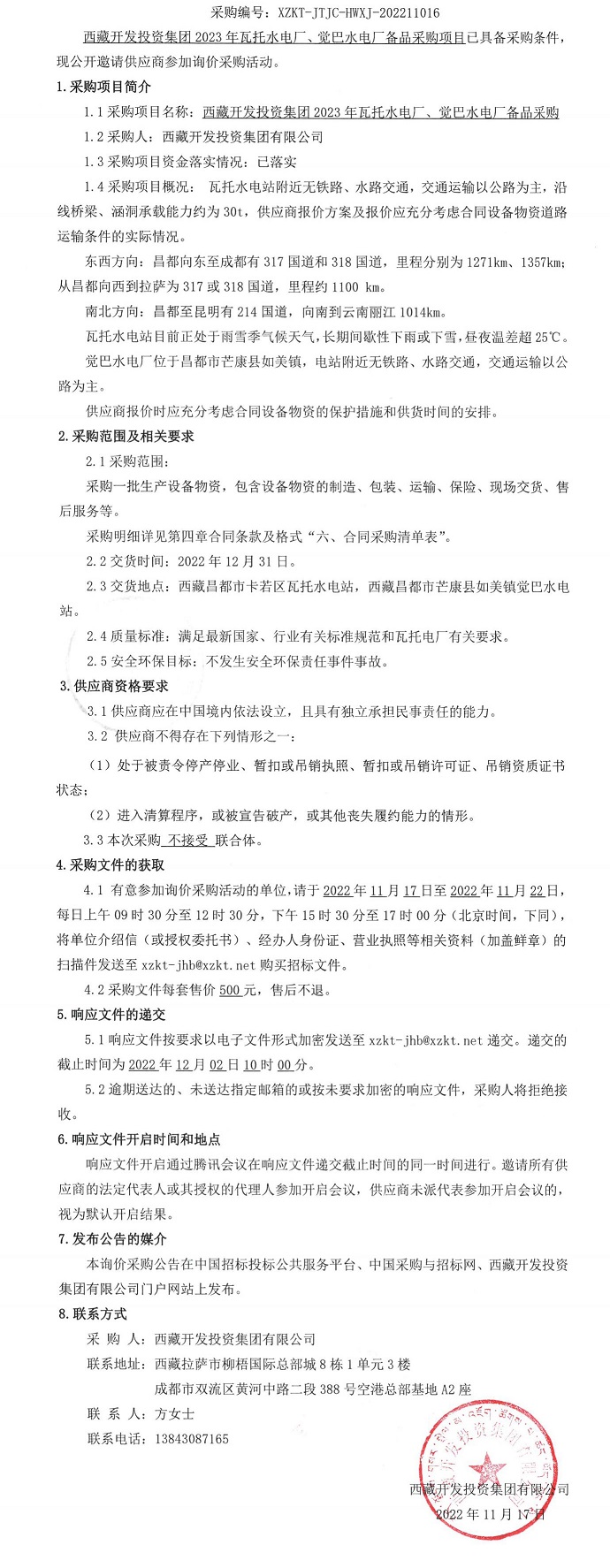 西藏開(kāi)發(fā)投資集團(tuán)2023年瓦托水電廠、覺(jué)巴電廠備品采購(gòu)公告