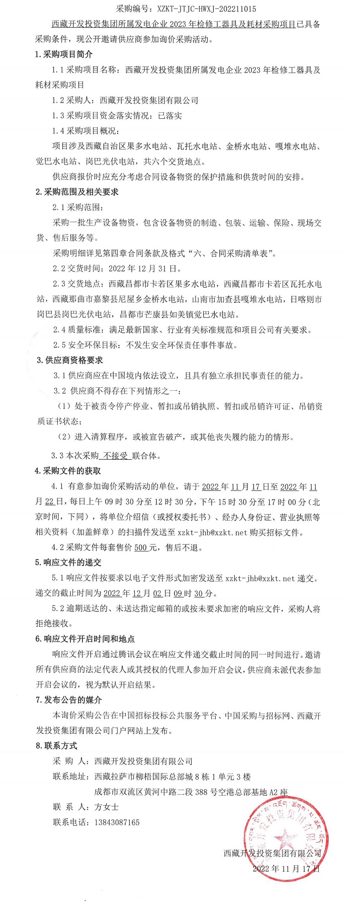 西藏開(kāi)發(fā)投資集團(tuán)所屬發(fā)電企業(yè)2023年檢修工器具及耗材公告