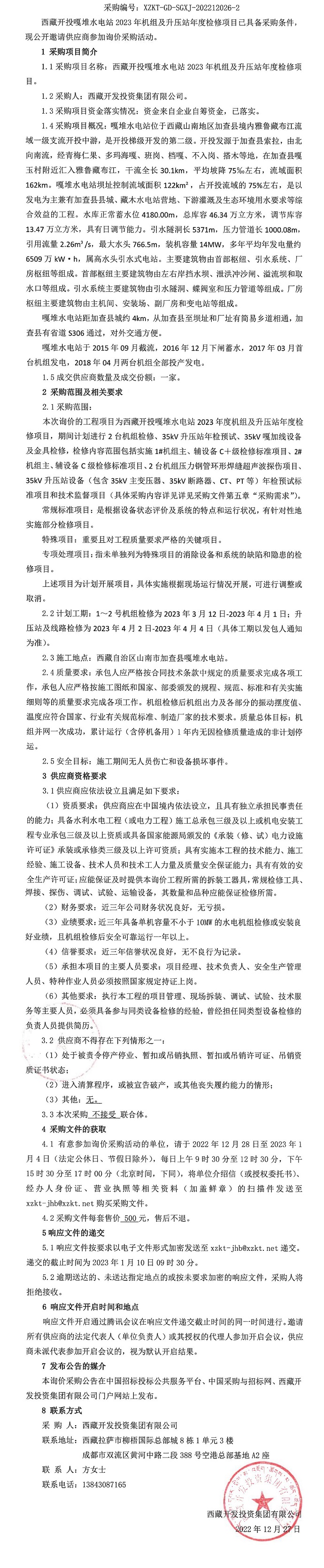 西藏開投嘎堆水電站2023年機(jī)組及升壓站年度檢修項(xiàng)目詢價采購二次公告