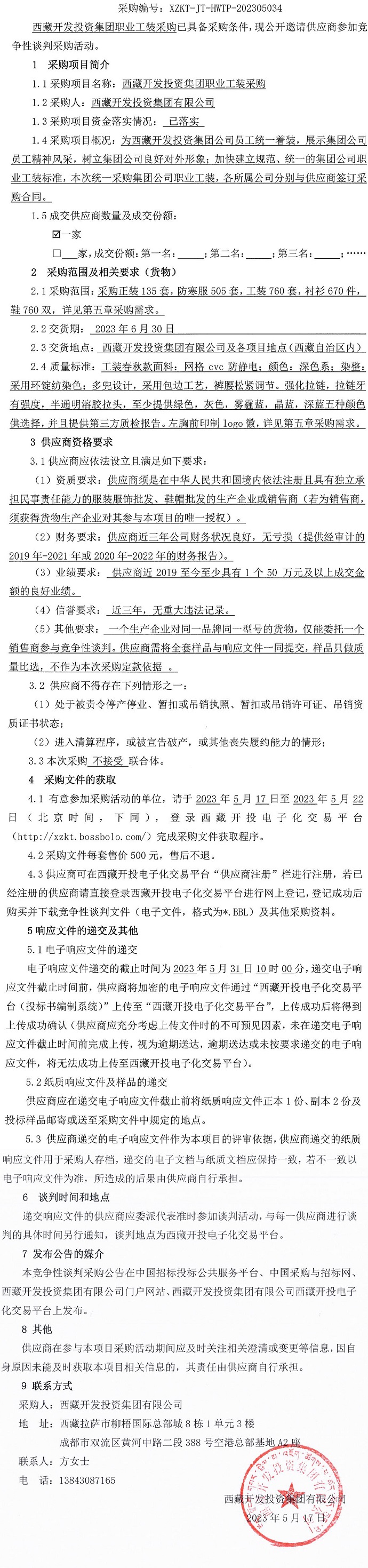 西藏開發(fā)投資集團(tuán)職業(yè)工裝采購競爭性談判采購公告
