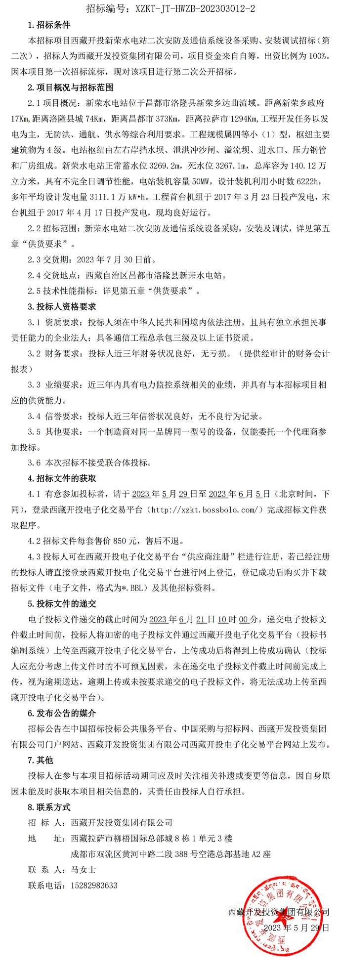 藏開投新榮水電站二次安防及通信系統(tǒng)設備采購、安裝調(diào)試招標(第二次)公告
