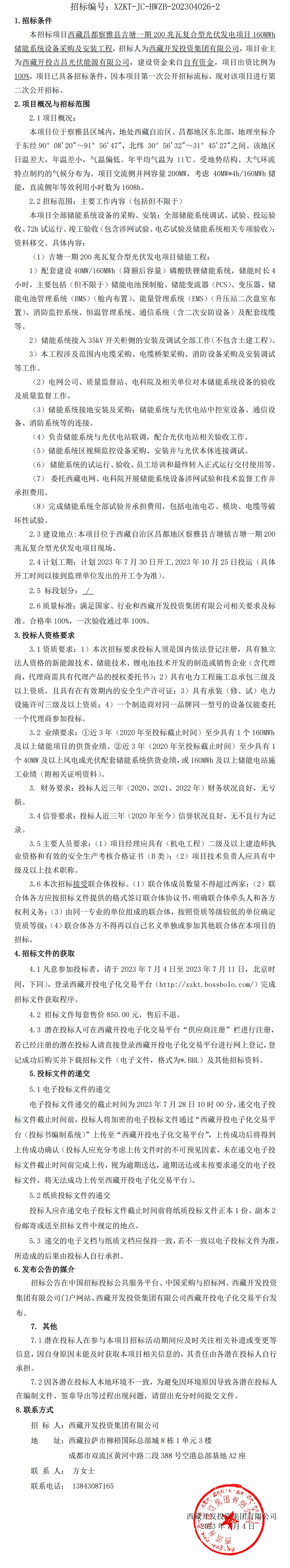 西藏昌都察雅縣吉塘一期200兆瓦復(fù)合型光伏發(fā)電項目160MWh儲能系統(tǒng)設(shè)備采購及安裝工程招標公告(第二次)