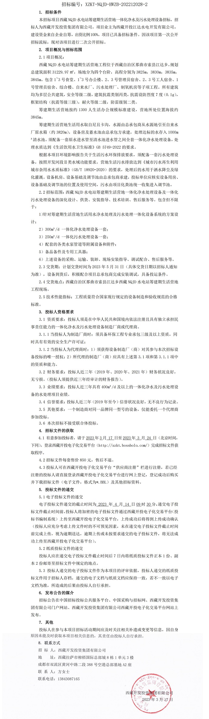 西藏 NQJD 水電站籌建期生活營地一體化凈水及污水處理設(shè)備招標公告
