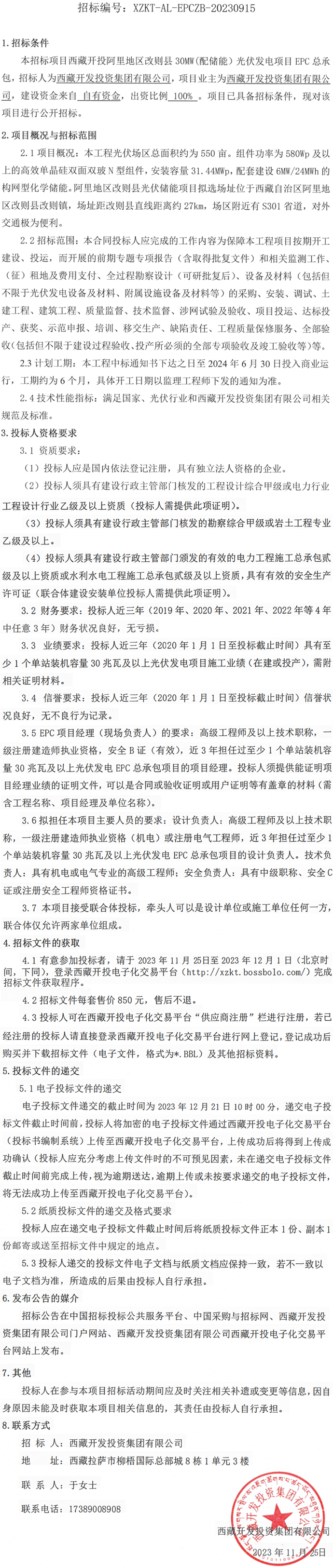 西藏開投阿里地區(qū)改則縣30MW(配儲(chǔ)能)光伏發(fā)電項(xiàng)目EPC總承包招標(biāo)公告