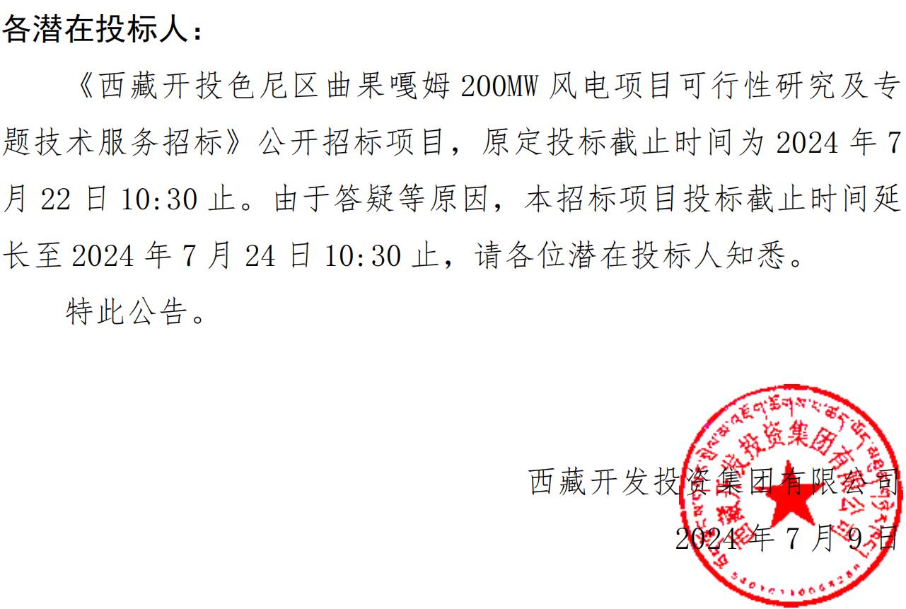 關(guān)于延長(zhǎng)《西藏開(kāi)投色尼區(qū)曲果嘎姆200MW風(fēng)電項(xiàng)目可行性研究及專題技術(shù)服務(wù)招標(biāo)》投標(biāo)截止時(shí)間的公告