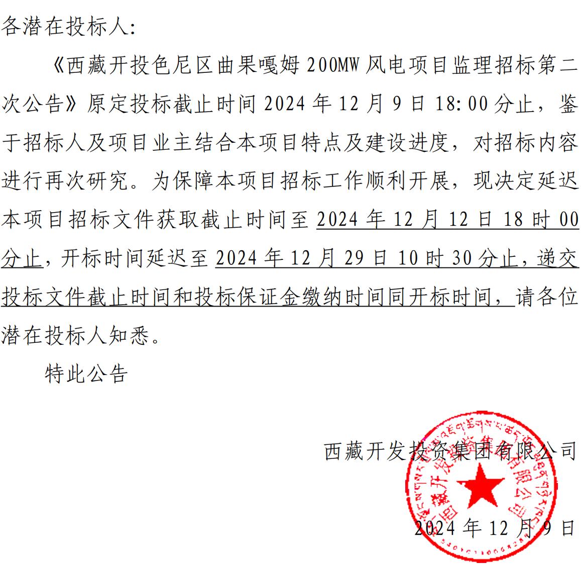 關(guān)于延長《西藏開投色尼區(qū)曲果嘎姆200MW風(fēng)電項目監(jiān)理招標(biāo)第二次公告》投標(biāo)截止時間的公告
