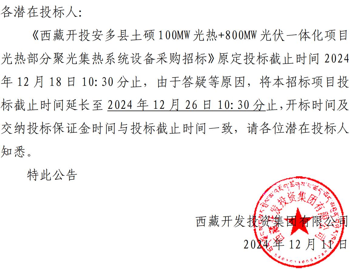 關(guān)于延長《西藏開投安多縣土碩100MW光熱+800MW光伏一體化項目光熱部分聚光集熱系統(tǒng)設備采購招標》投標截止時間的公告